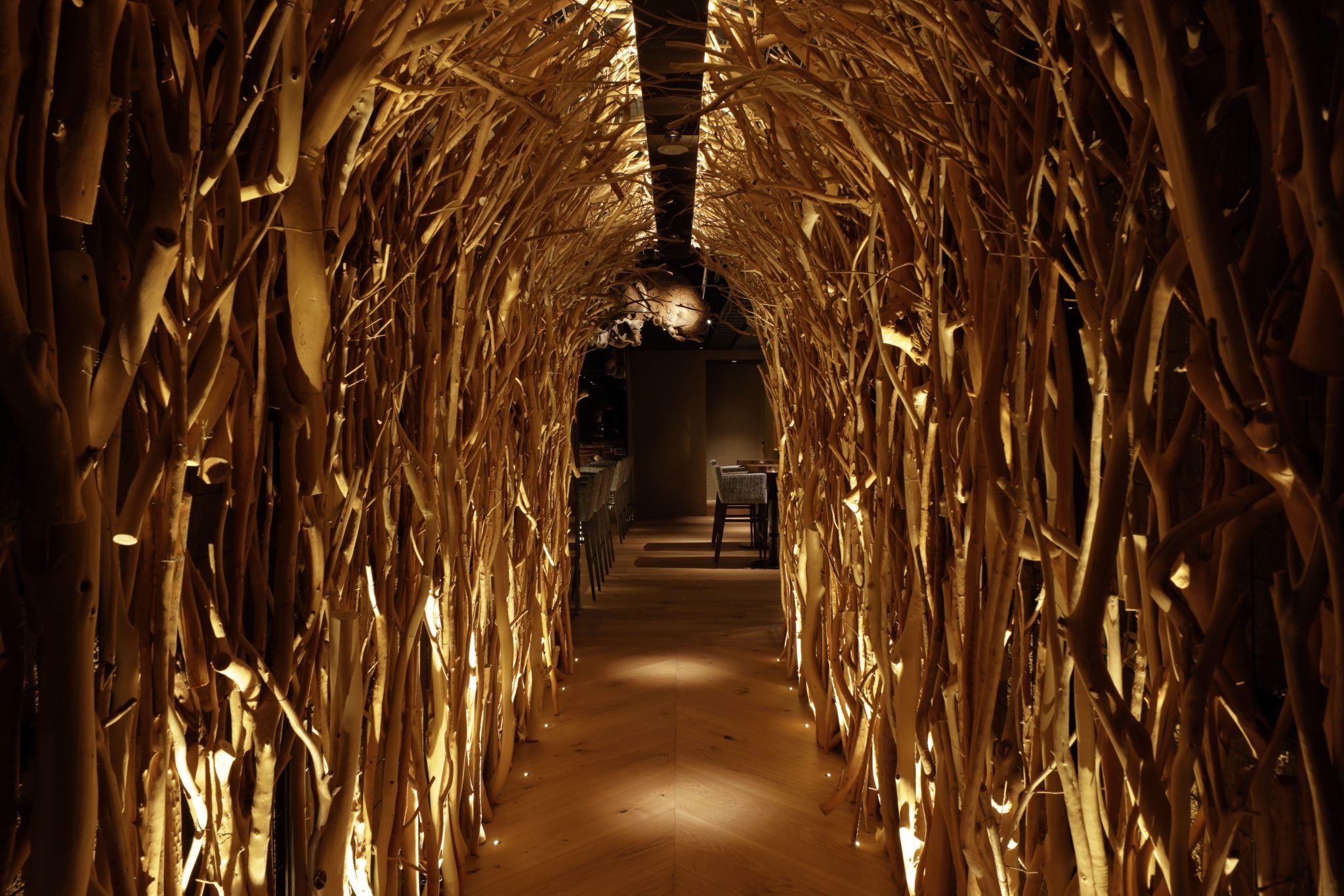 Step away from Kitanozaka’s bustle and enter a forest-like haven through a wooden gate. Rare timbers, a log bar, and magnolia roots create a warm space, with sounds from a central DJ booth. Centered on wood-fire cooking, this innovative French restaurant blends the memories of wood with modern sensibilities for an extraordinary dining experience.