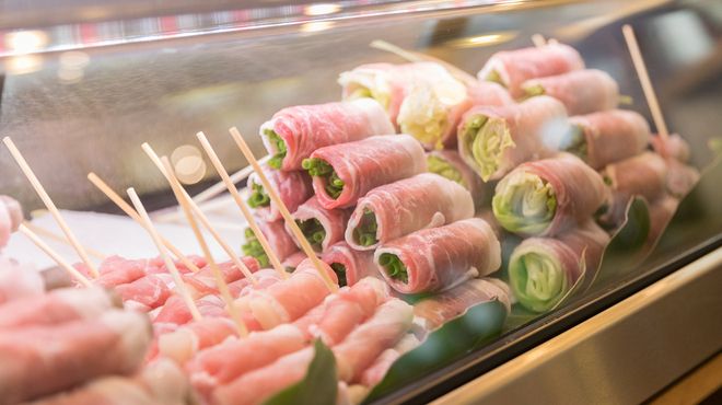The wooden tables, partition walls, lanternlike lighting, and ceiling objects give off an exotic yet friendly atmosphere. Their skewers are very popular, made with various vegetables rolled with Okinawa Agu pork. They recommend 8 or 5 vegetable rolls selected by them. There are several courses where you can enjoy this vegetable roll assortment and several of their typical menu items together.