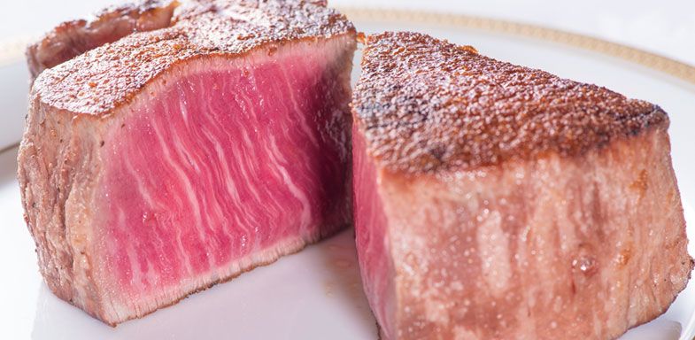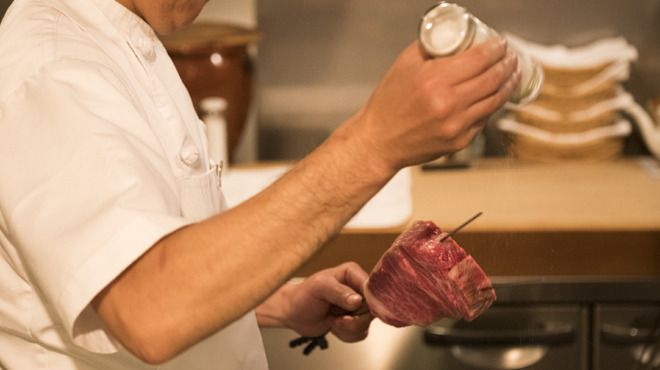 The spacious interior is retro and gorgeous. The Nishijin-ori woven wallpaper and cherry-blossom wood chairs, unchanged since our inception, exude a calm and refined atmosphere. Our signature dish is a charcoal grilled beef steak, made with special high-grade Tajima beef. We only use cuts of the highest quality. For guests who prefer seafoods, we recommend our limited-quantity home-smoked salmon.