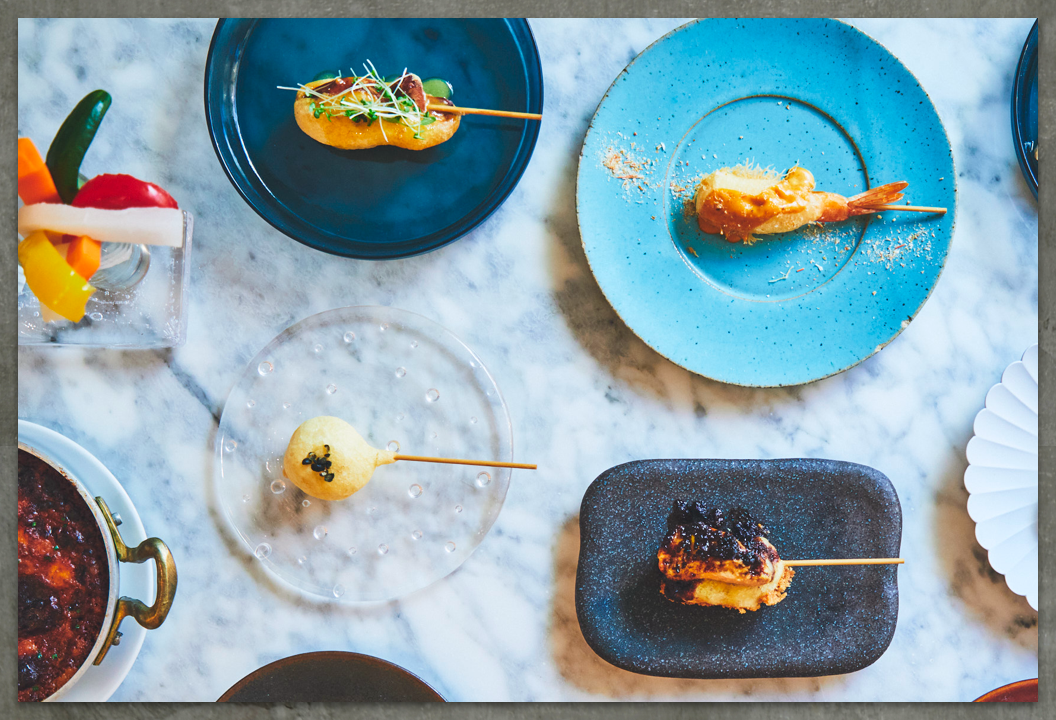 木と大理石で仕上げた、高級感溢れるシンプルモダンの空間。落ち着いた雰囲気の中で、フランス料理と串カツを組み合わせたオリジナルメニューをお楽しみいただけます。生ハムやエビ、牛肉など、海と山を問わない幅広い食材を使用した串カツでございます。そして、コースでお任せいただくと、串カツに加えてサラダや各種スープなど、その季節に最もふさわしいメニューをご提供いたします。