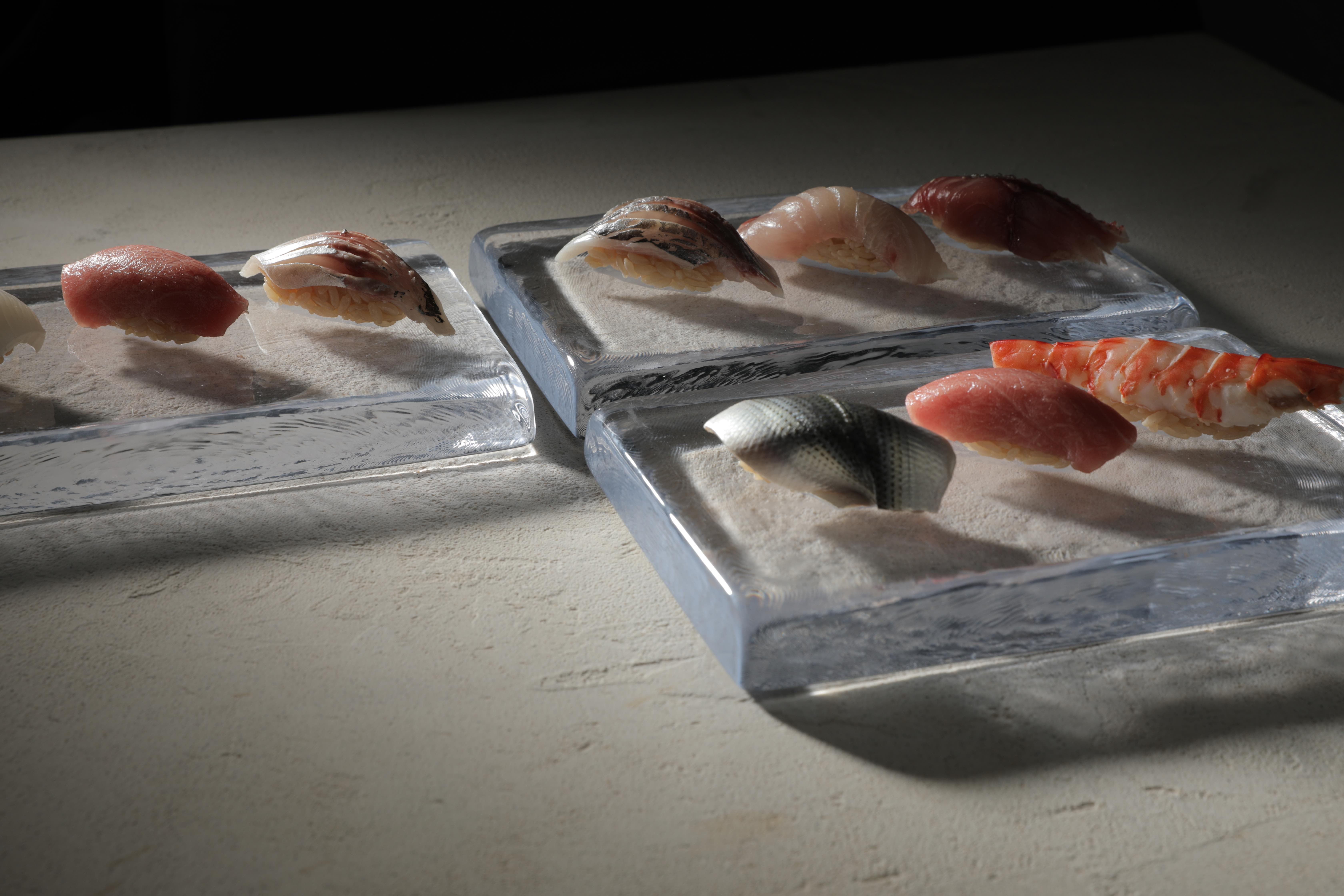 Appetizers · Five-piece nigiri assortment · Shellfish nigiri · Tempura hand roll · Grilled scallop Isobe-yaki (with nori) · Kuruma ebi nigiri (Japanese tiger prawn) · Uni (sea urchin) · Three kinds of tuna · Simmered anago nigiri (conger eel) · Tamagoyaki (Japanese omelet) · Soup