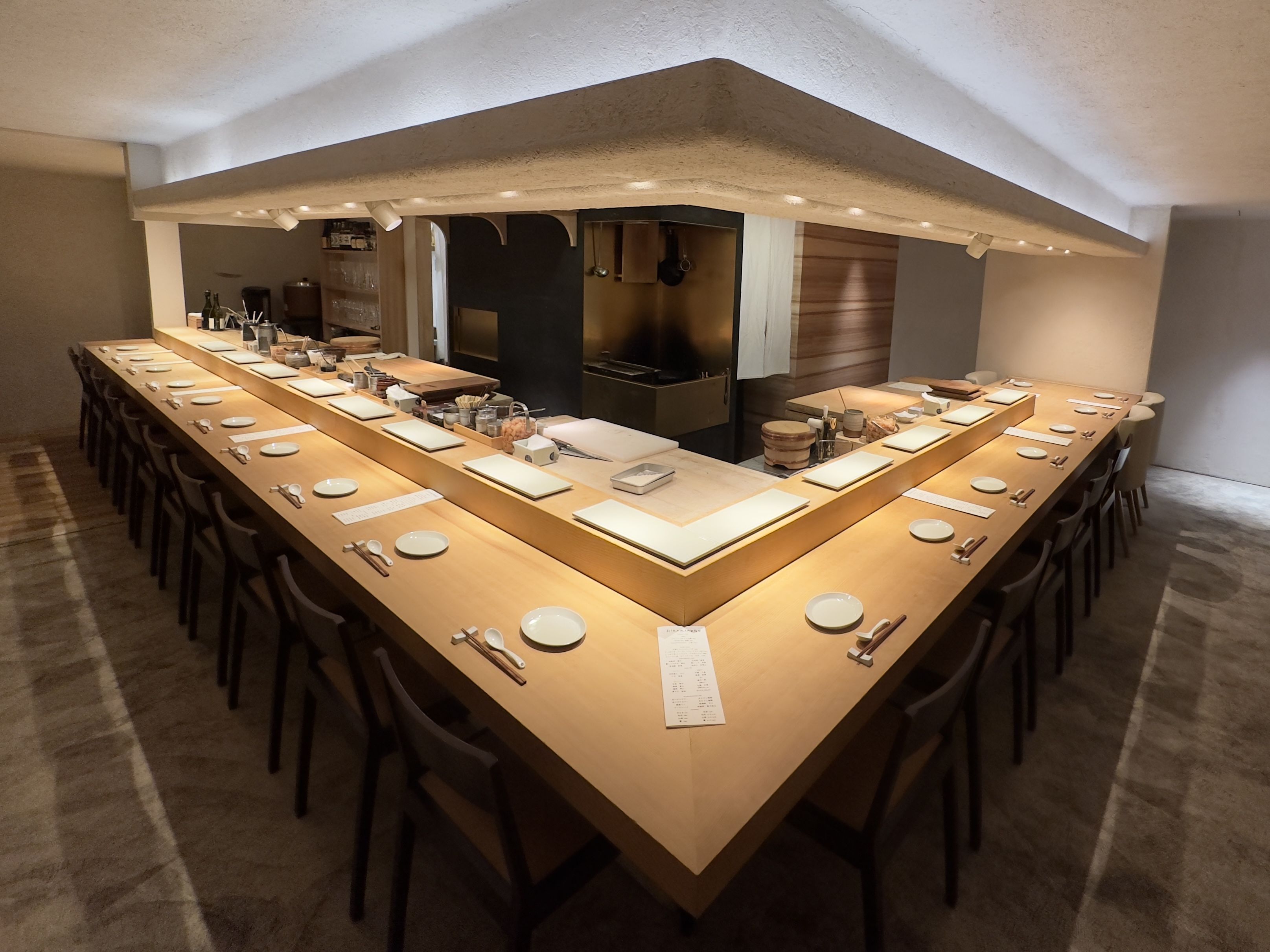 Appetizers, Two kinds of sashimi, Two fried items, Three nigiri, Shellfish nigiri, Hotate isobeyaki (grilled scallop with nori), Kuruma-ebi nigiri (tiger prawn nigiri), Appetizers, Uni (sea urchin), Three kinds of tuna, Ramen