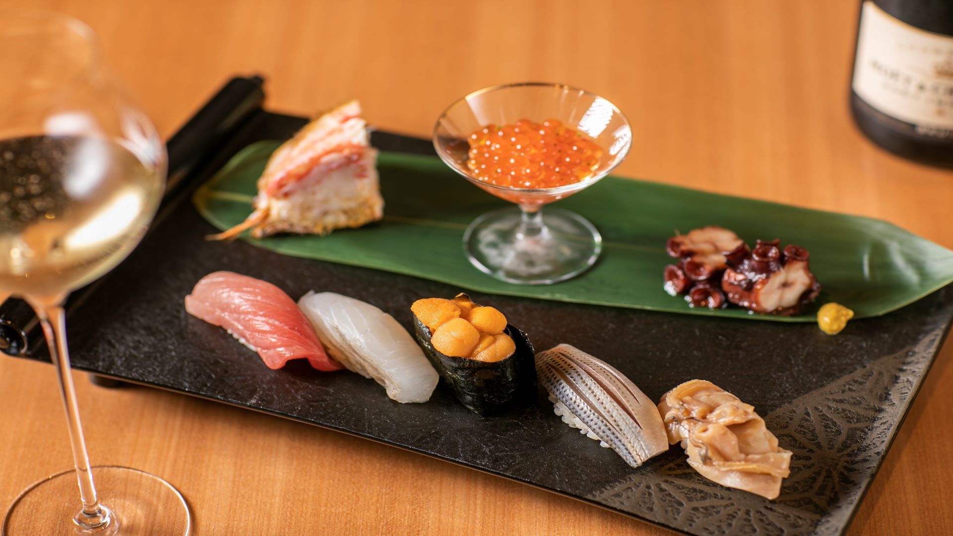 ~On a plate~ Jellied Monkfish with Monkfish Liver and Canola Flower Dressed with Yuba Sea Cucumber and Turnip Topped with Small Scallop and Crab Dressed with Grated Radish Tuna, Grouper, Pen Shell and Sweet Shrimp Served with Soy Sauce and Wasabi
