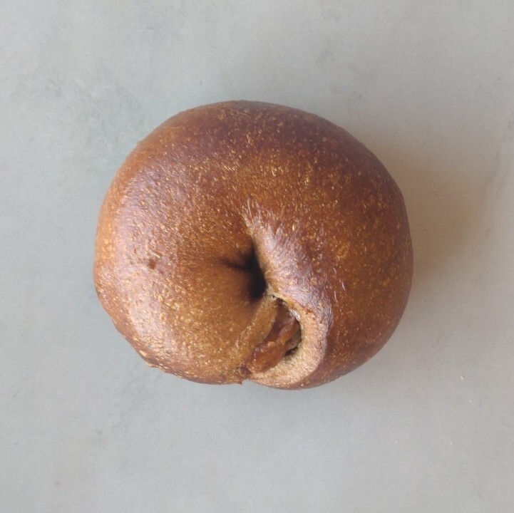 A coffee dough bagel sandwiched with plenty of bean paste and salted butter.