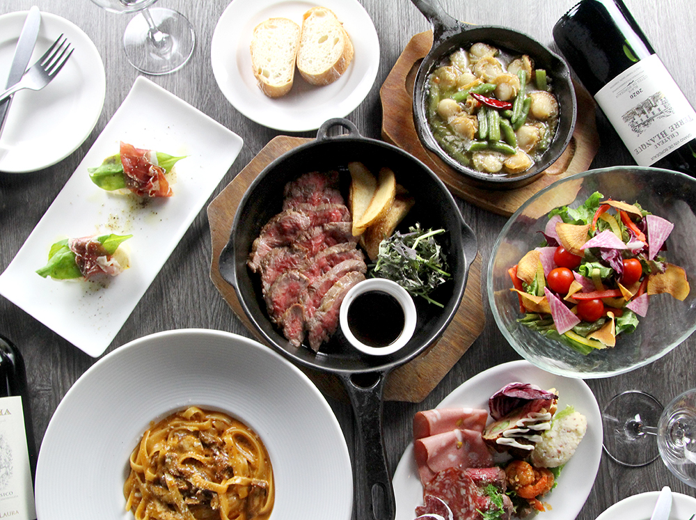 ドリンク別途/アンガス牛ランプのステーキをメインディッシュとし、ポルチーニのトマトクリームパスタやアヒージョ・前菜盛合わせなど充実した料理内容。デートや会社同僚・友人など幅広いご利用に最適です。