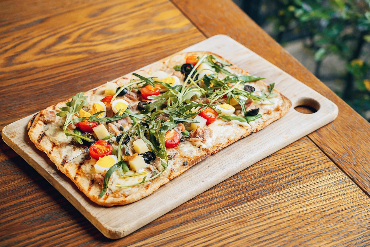 Nicoise salad pizza with mozzarella, green bean, potatoes, tuna confit, olives, arugula and quail egg