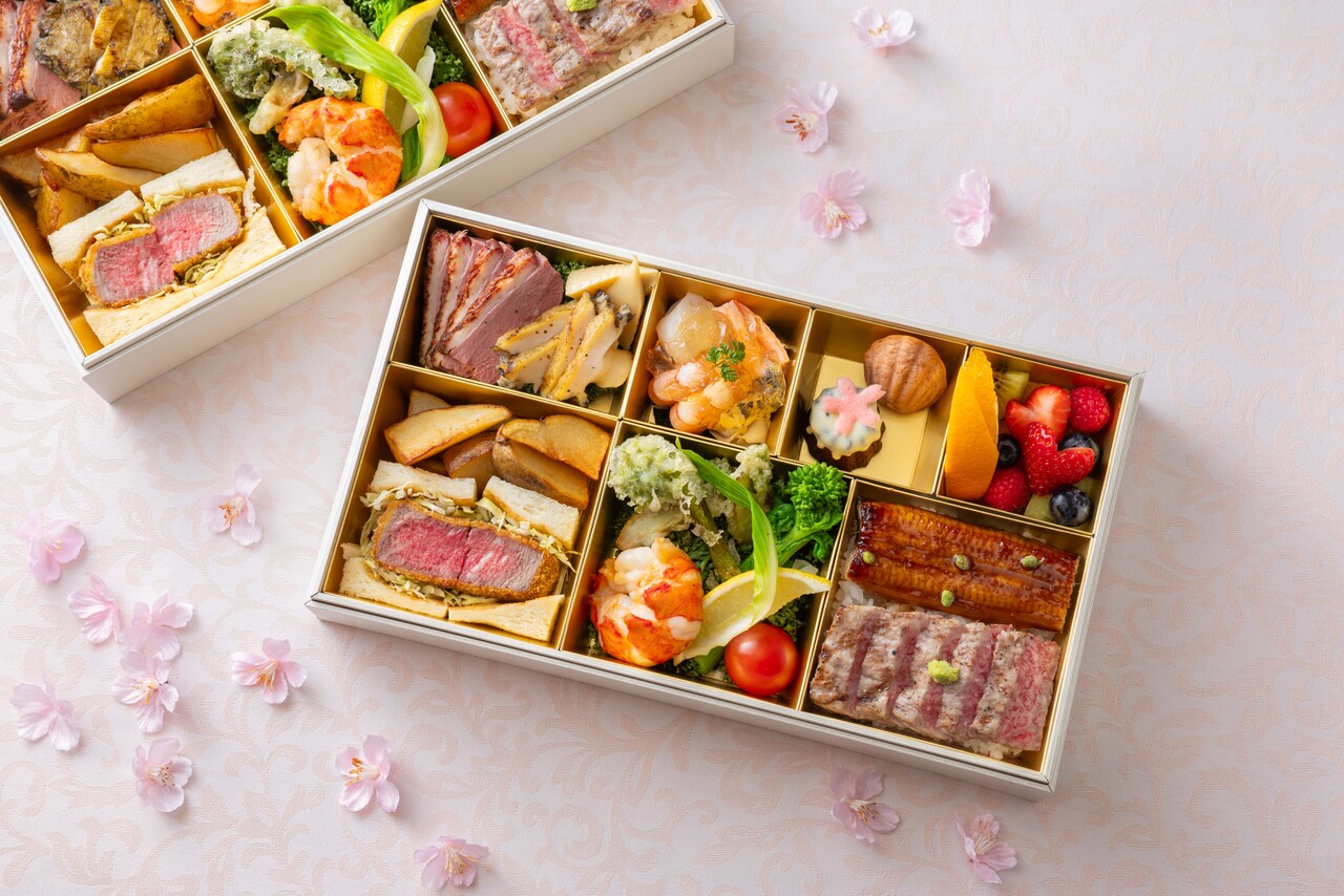 前菜からデザートまで、定番人気メニューや、春ならではの食材を用いた逸品を詰め合わせた、贅沢なお弁当です。「鴨と鮑の冷菜」や「オマール海老のフリチュール」など高級食材のほか、メインの「黒毛和牛ステーキ重・うな重」、「黒毛和牛ヒレカツサンド」などボリュームも十分。見た目にも楽しく、彩りも味わいも豊かなお弁当に仕上げました。