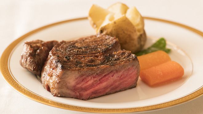 The spacious interior is retro and gorgeous. The Nishijin-ori woven wallpaper and cherry-blossom wood chairs, unchanged since our inception, exude a calm and refined atmosphere. Our signature dish is a charcoal grilled beef steak, made with special high-grade Tajima beef. We only use cuts of the highest quality. For guests who prefer seafoods, we recommend our limited-quantity home-smoked salmon.