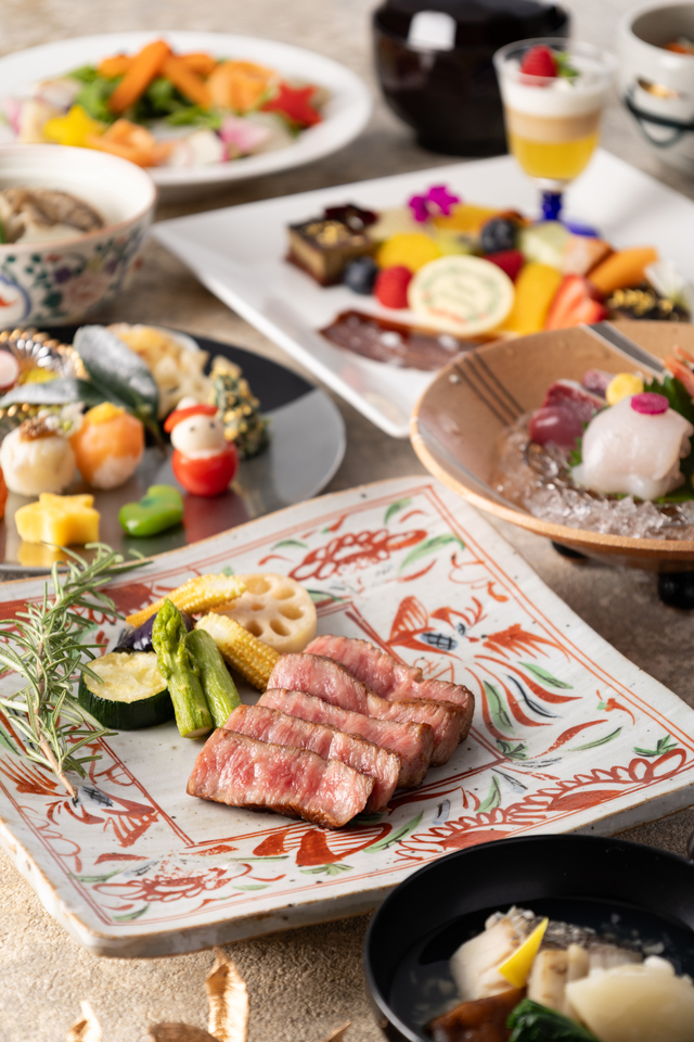【内容】前菜/サラダ/スープ/焼野菜/甘鯛湯葉蒸し/季節の鮮魚/黒毛和牛ヒレステーキ または サーロインステーキ/お食事(白御飯、色御飯またはガーリックライス)/デザート