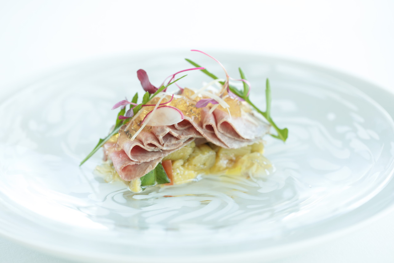 - Domestic beef cheek braised in red wine, accompanied by conchiglie stuffed with truffle-scented potatoes