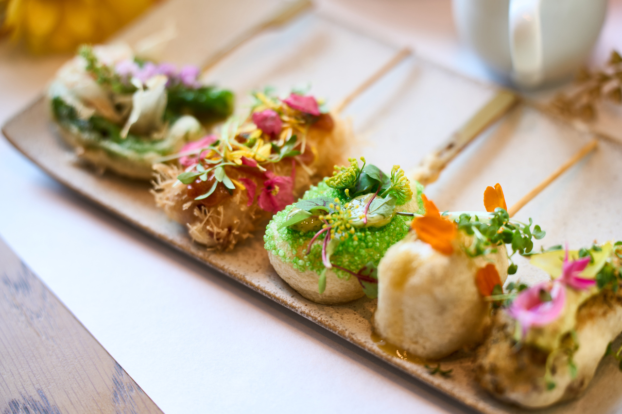 BEIGNETの技と美意識を注ぎ込んだ最上位ランチコース。海の幸のタルタルや白レバームースのミニパルフェなど、花園のように華やかな前菜から始まります。スペシャリテ串7種は、甘鯛や牛タン、フォアグラを用い、素材ごとに衣・火入れ・ソースを変えるこだわりの一品。締めは特製揚げリゾットとデザート、食後のカフェで優雅な余韻を。記念日や特別なランチにふさわしい、五感で味わうコースです。