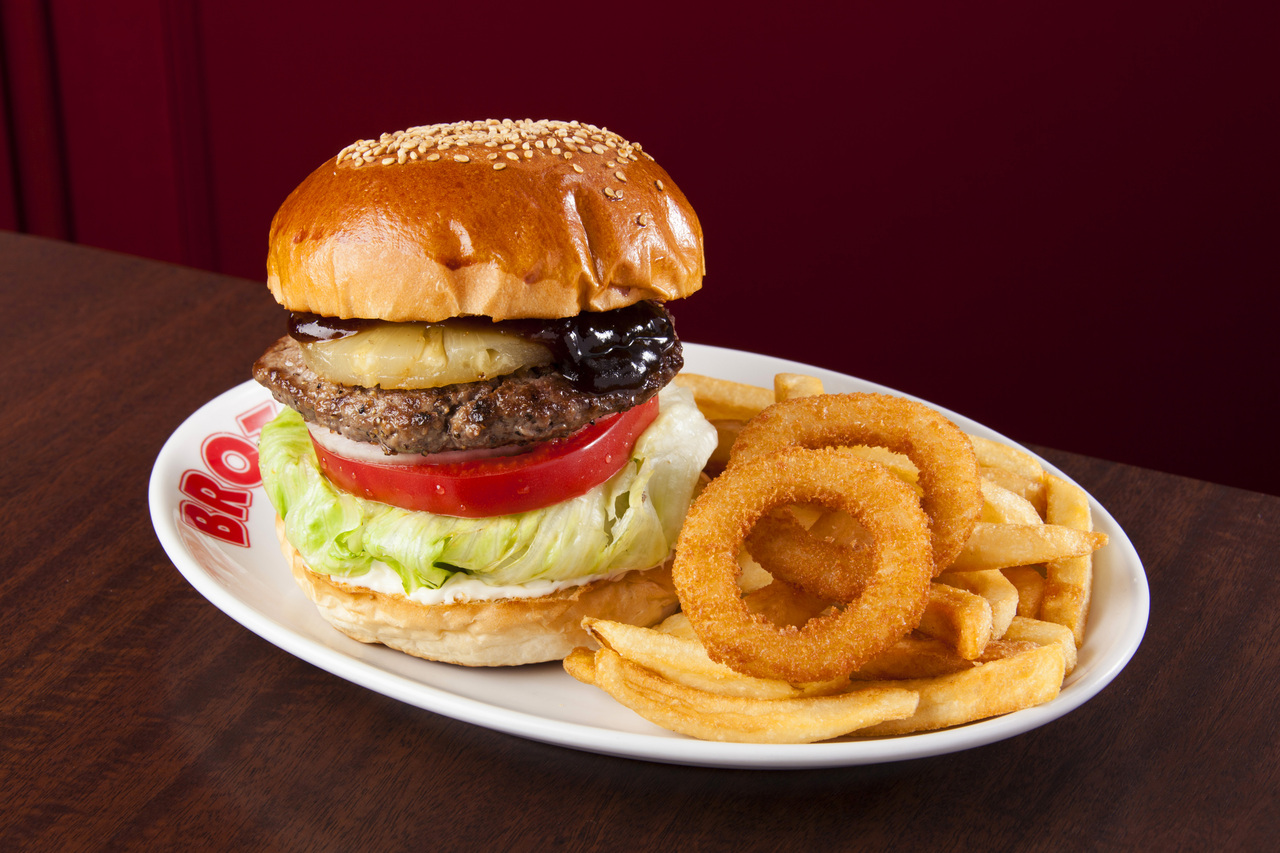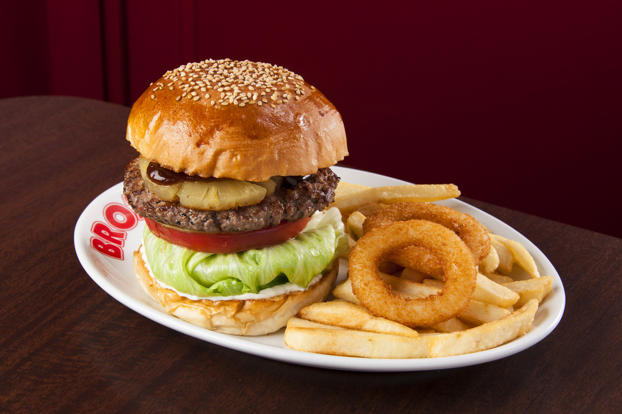 ハンドチョップビーフを使用したパティにチーズ、ベーコン、パイナップル、エッグを挟みました。