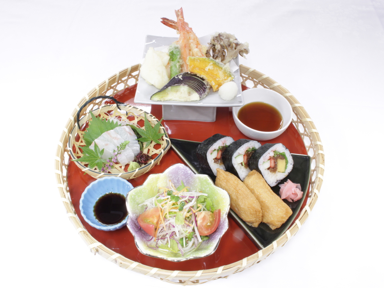 天ぷら、刺身、サラダ、巻き寿司、いなり寿司、椀物