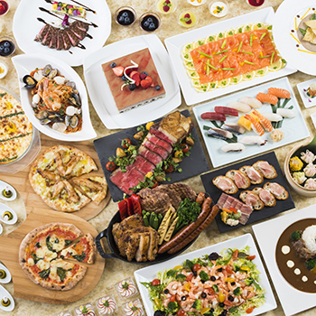 人気のローストビーフや窯焼きピッツァ、にぎり寿司など、前菜からデザートまで約60種類のメニューをお楽しみください。