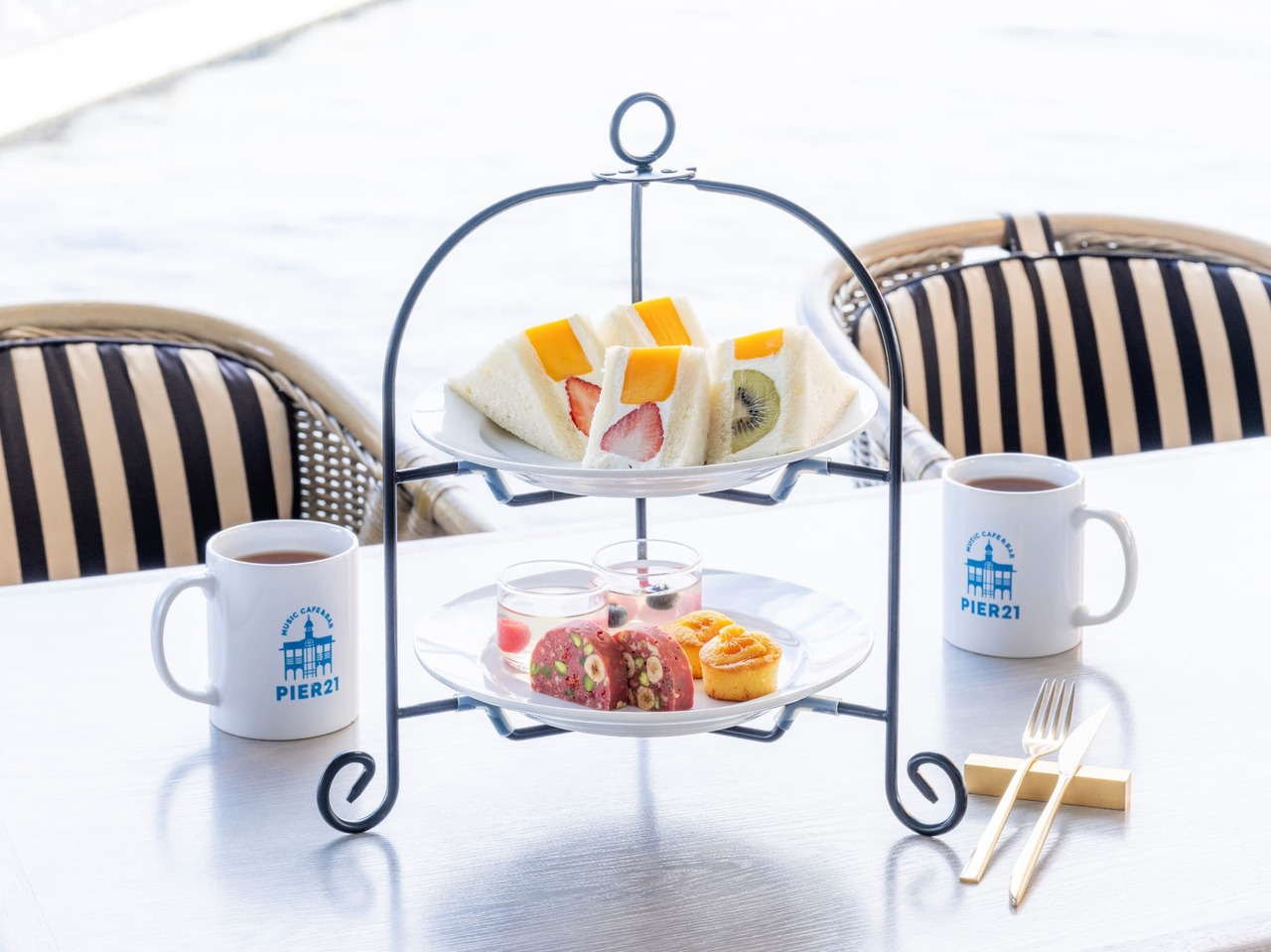 The "Fruit Sandwich Set" is made with the hotel's specially made fresh cream and fresh, juicy fruits. Enjoy a relaxing tea time with six kinds of free cafe drinks at the cafe and bar on the pier, where music is playing.