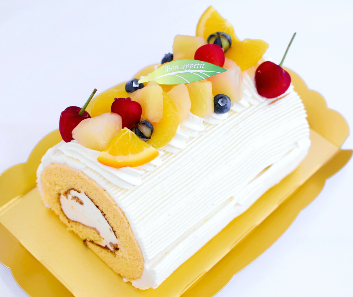 ふわふわのロールケーキの上で生クリームと季節のフルーツをトッピングしています。