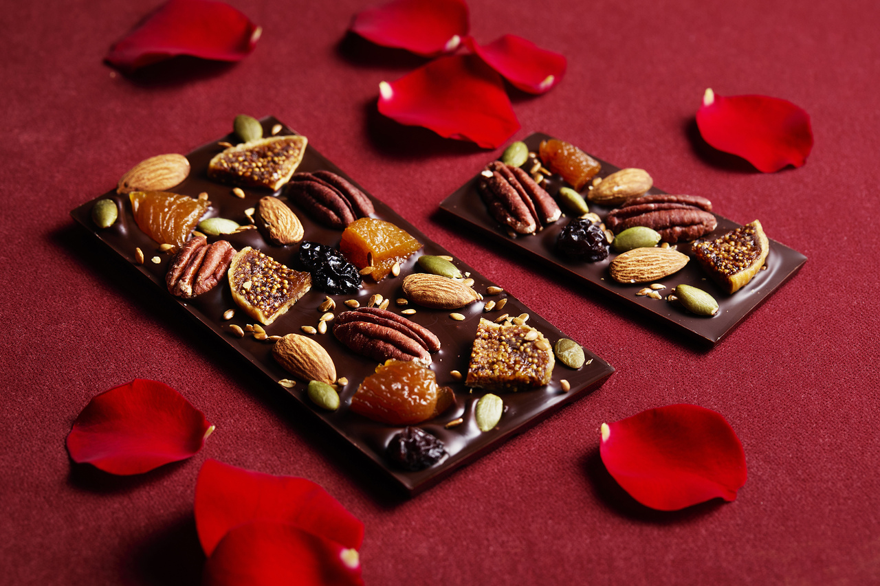 This beautiful looking chocolate bar is made from a tablet of Valrhona vegan chocolate and is studded with figs, nuts, and dried fruits like jewels.