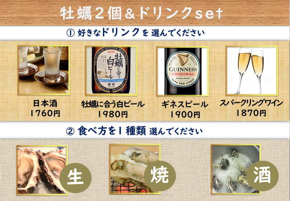 2 raw oysters, 2 fried oysters, sake-steamed oysters, Okada-age, small side dish, pickles, oyster rice, clear soup