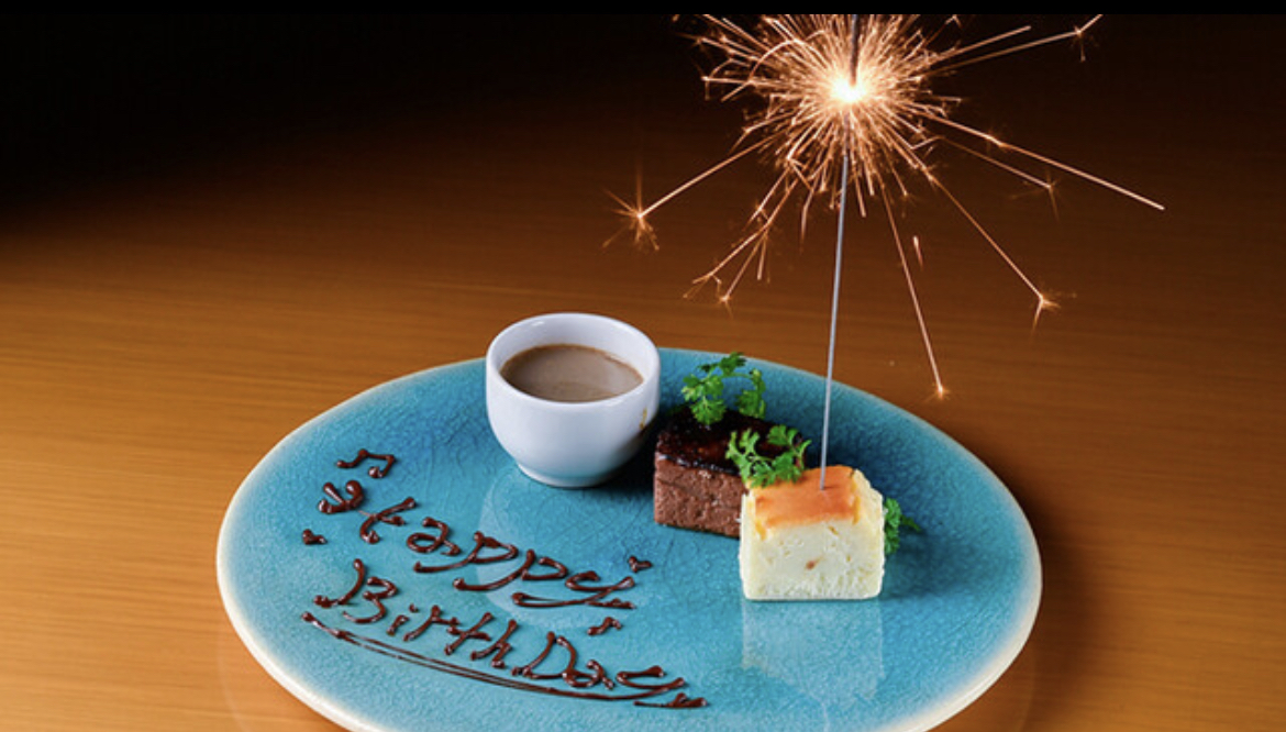 デザートのタイミングで花火とチョコレートでお祝いの文字をお書きしたプレートをお出しします。