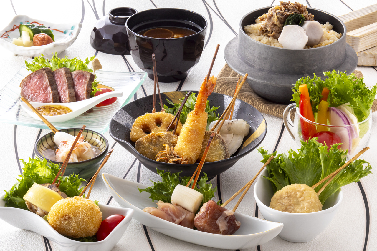 Skewers: Kobe pork with Japanese pepper sauce, Hyogo Prefecture eggplant with sweet and spicy sauce, Awaji onion curry flavor, miso sauce dumplings, ❝The ultimate game❞ Himeji Marugyo Suisan stingray fried shrimp, beef, and three other kinds Salad: Stick vegetable dish Side dish: Octopus rice, red miso soup, pickled vegetables Dessert: Sherbet