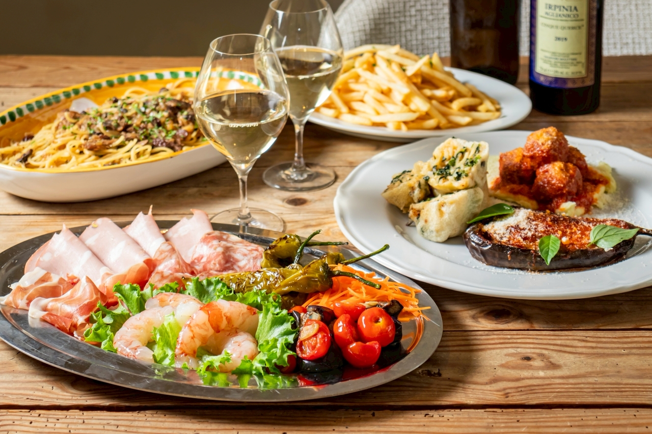 前菜盛り合わせ+お好きなパスタをチョイス+本日の鮮魚料理+薪火グリルの盛り合わせ+フォカッチャ付き