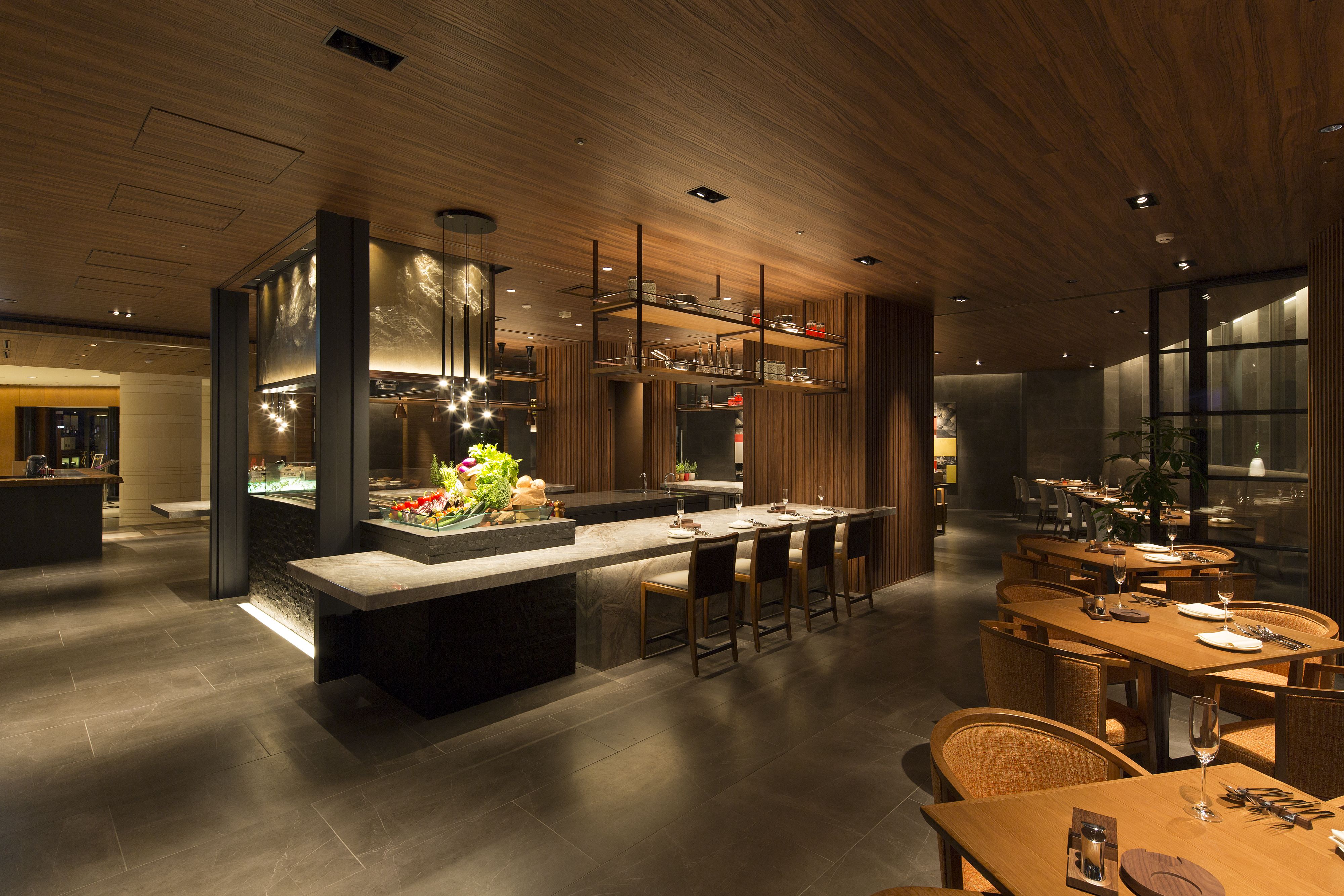 THE MARKET F is a "Bistronomy"-style all day dining restaurant located within Grand Hyatt Fukuoka. Guests are welcomed by an open kitchen and charcoal grill in the center of the floor.