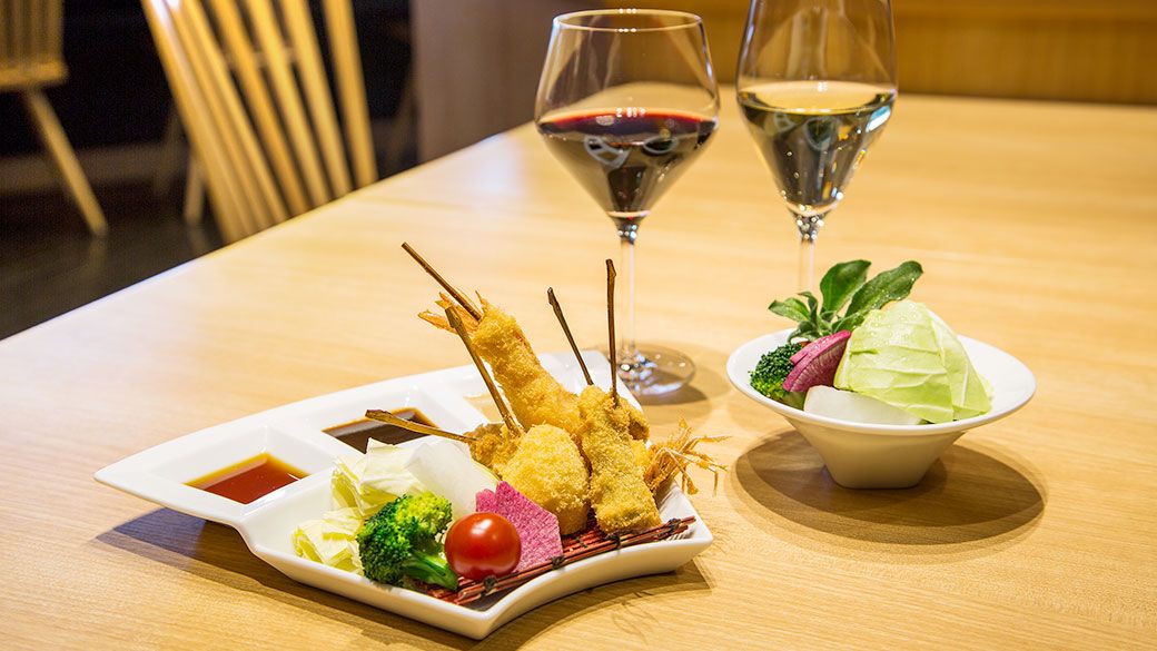 Enjoy fine kushiage (deep-fried foods on skewers) made from local ingredients along with a wide selection of wines.