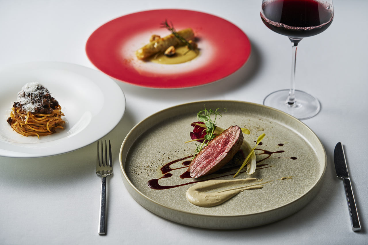 ■ Carne: Kuroge Wagyu sirloin and foie gras duet, with Jerusalem artichoke crema and Marsala sauce
