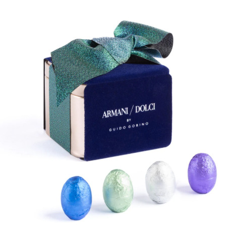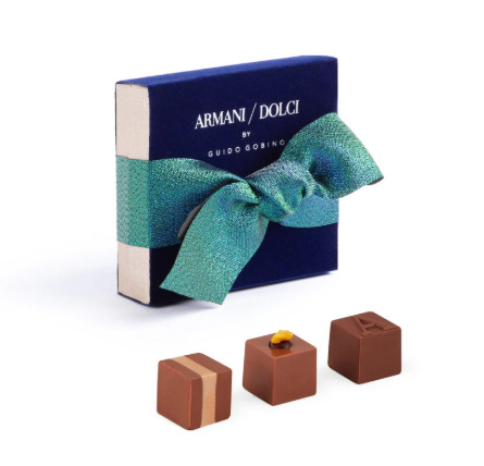 This spring, Armani/Dolci presents a new collection that blends innovative flavors with sophistication and playfulness. The packaging, featuring a deep blue velvet-like sleeve and a large, iridescent deep sky-blue ribbon, is reminiscent of the evening looks from the Giorgio Armani Spring/Summer 2026 collection, which was unveiled at the Pinacoteca di Brera in Milan last September.