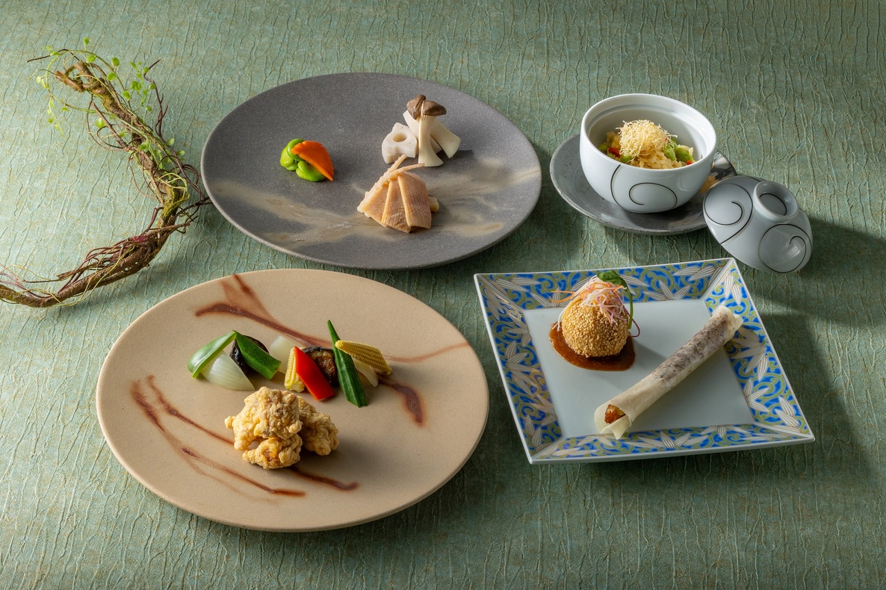 エディブルフラワーを添えたサラダや翡翠色が美しい餃子など、彩り豊かなお料理をご用意しました。地元食材「