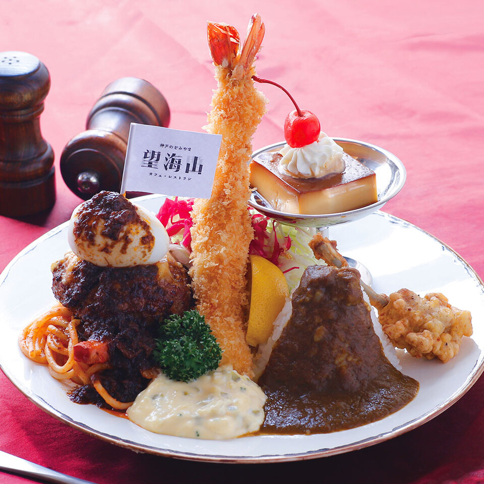 当店自慢の「デミグラスハンバーグ&ナポリタン」や「手作り海老フライ」、シェフ手製のミックススパイスを使用した「スパイシーカレー」と『自家製デザート』を少しずつ一度にお楽しみいただける特製ワンプレートランチです