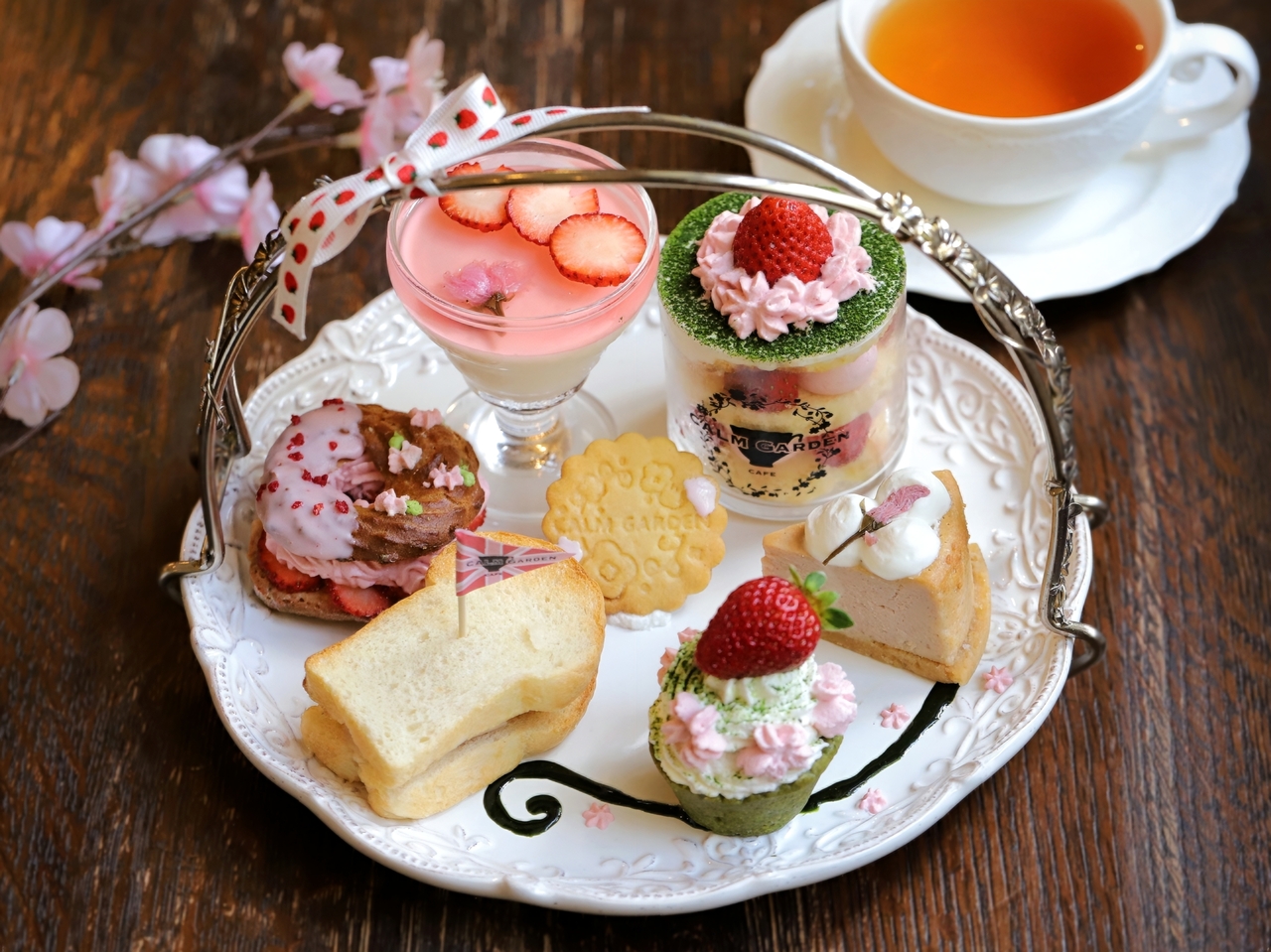 Strawberry and cherry cream trifle, cherry and strawberry cheesecake, strawberry and cherry matcha tart, hot sandwich (sauteed chicken thigh with salted rice malt), cherry jelly panna cotta, cherry strawberry Paris-Brest