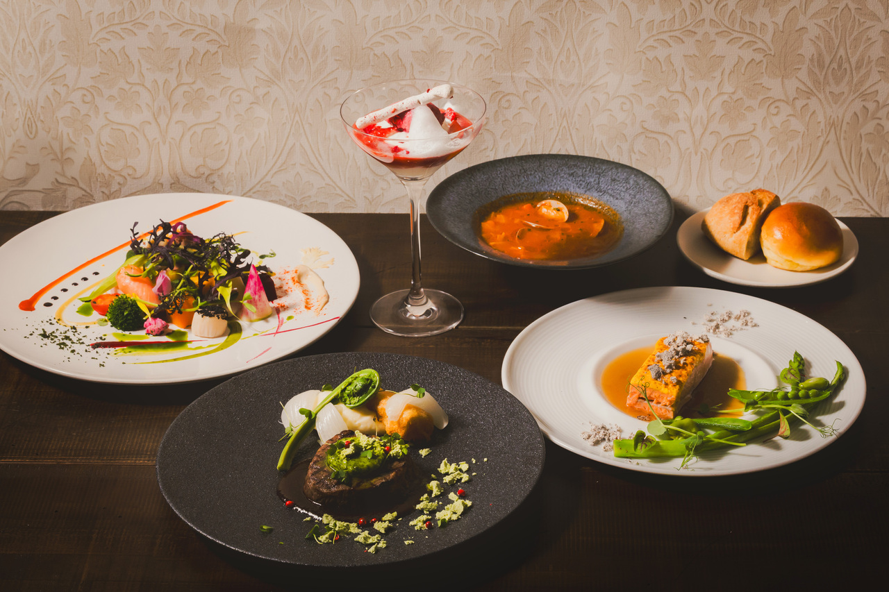 マッシュルームの旨みをまとった香ばしい銀鮭のヴァプールと、ハーブを添えた北海道産牛フィレのグリエに、色鮮やかな前菜&スープ&パン、デザートが付いたおすすめのプリフィックスランチコースです。メイン料理は、+600円でステーキフリットに、+1000円で黒毛和牛ステーキに変更できます。