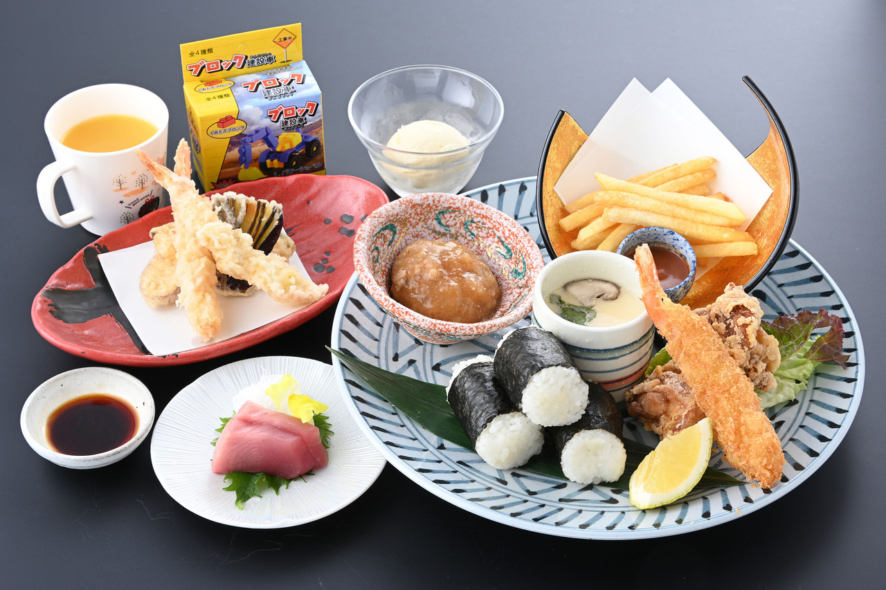 Panko-fried shrimp (Ebi Fry), Hamburger steak (Hambāgu), Karaage (Japanese fried chicken), French fries, Chawanmushi (savory egg custard), Omusubi (rice ball), Jelly, Juice