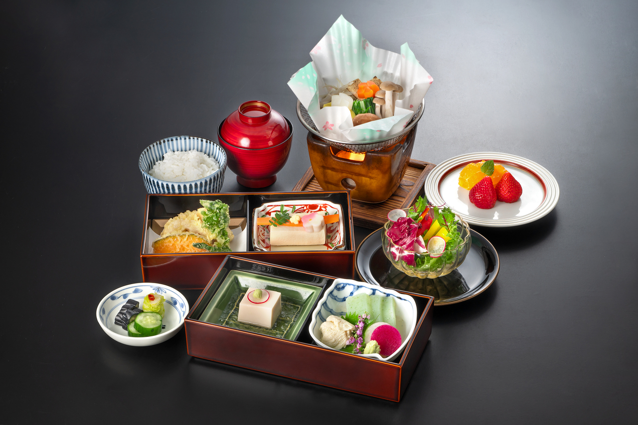 Each dish is presented in a colorful bowl, with a focus on ingredients from Okayama and the Seto Inland Sea, and is beautifully presented in a lattice wooden box.