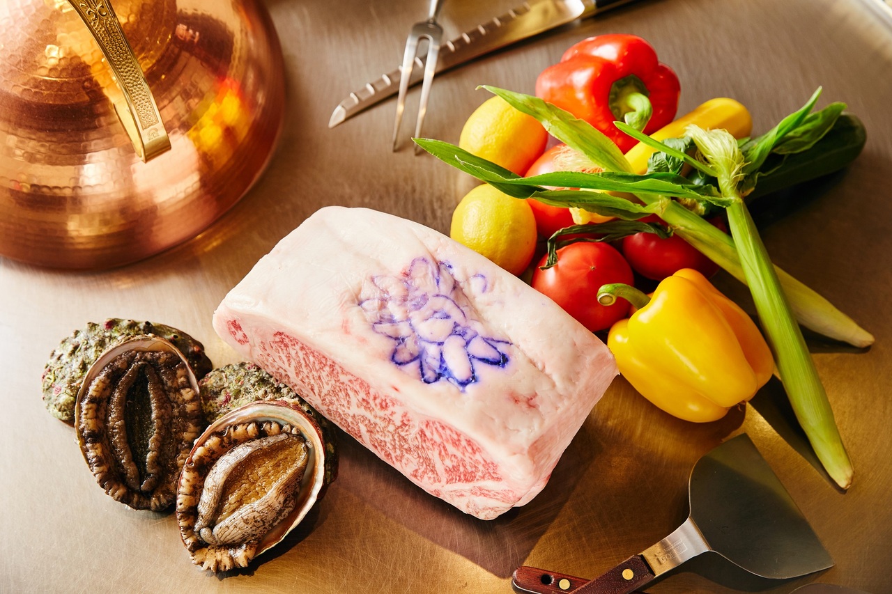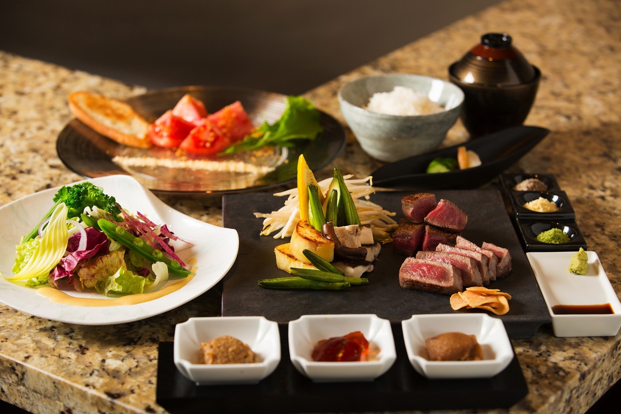おもてなしの「焼きトマト」から始まり、料理長が厳選した九州産黒毛和牛ロースと、旬の鮮魚を鉄板で丁寧に焼き上げます。