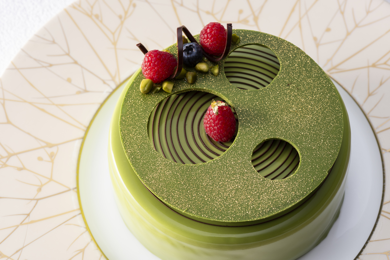 ケーキ。ロイヤルティーヌとアーモンドの生地を底に敷き、香ばしいピスタチオのムースと生地に、甘酸っぱいベリージャムを幾層にも重ねました。枯山水を思わせるケーキの上には、繊細な抹茶のチョコレートをあしらい、パリッとした食感がアクセントに。上品なピスタチオの香りとベリーの酸味が調和した爽やかな味わいは、特別な夜を優雅に彩ります。