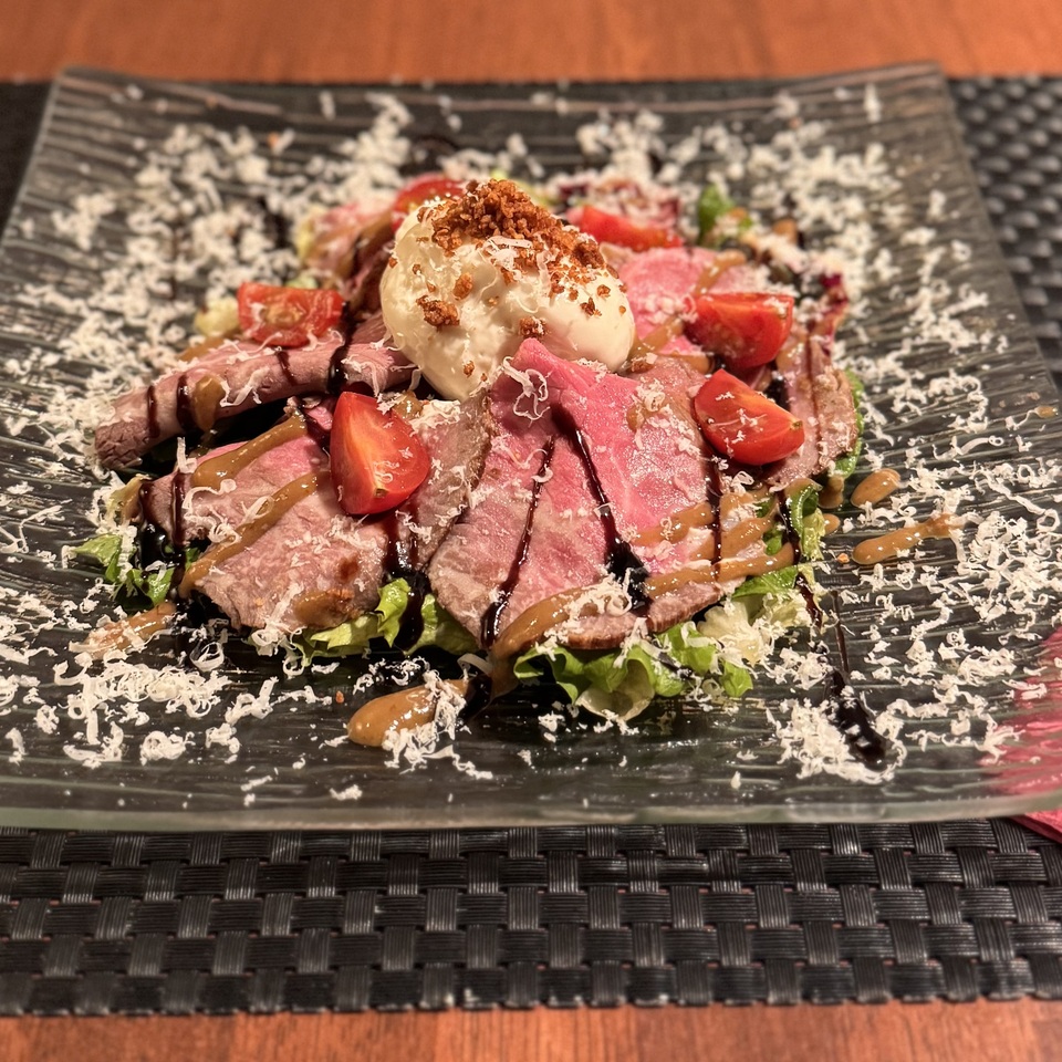 薄くスライスしたローストビーフでも肉の旨味はそのままに!店内でも人気の一品です!