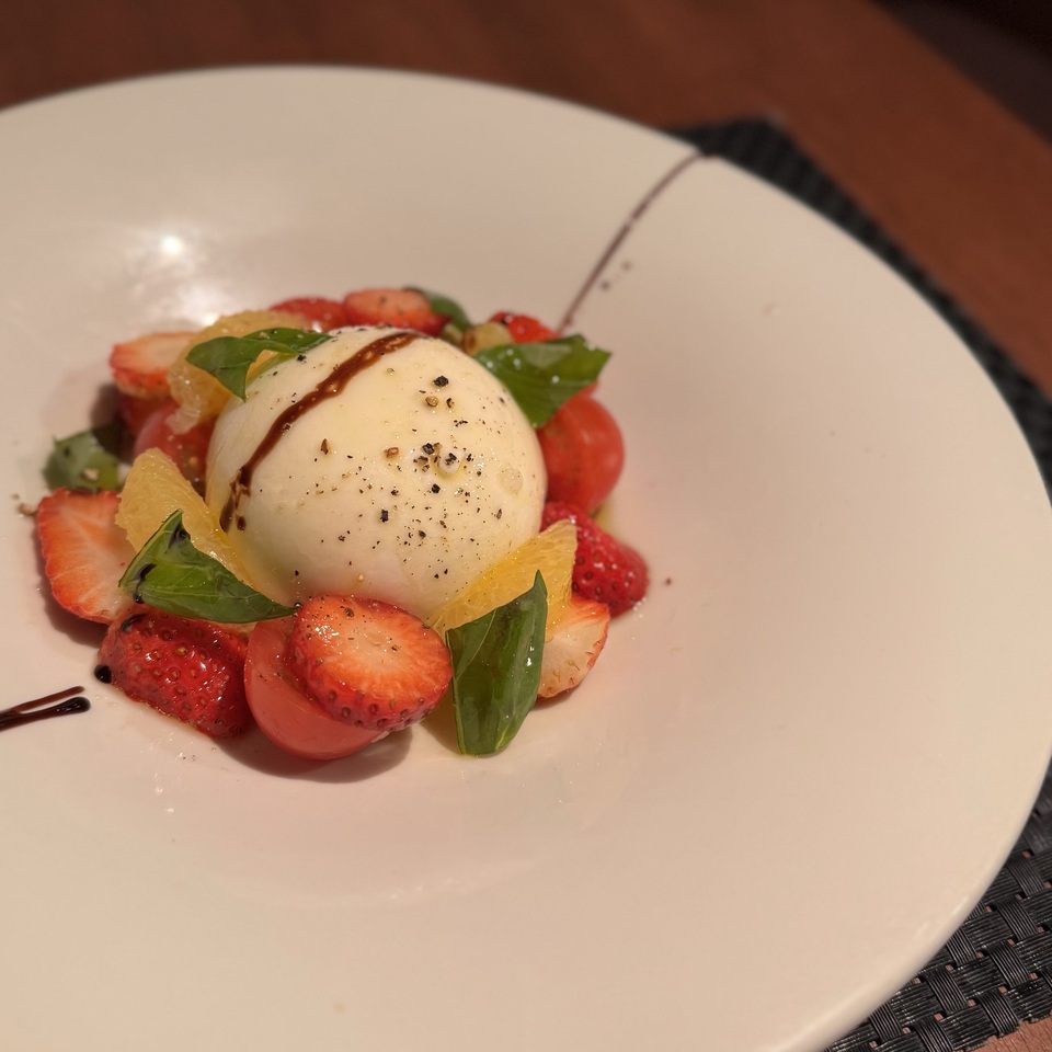 ③赤海老のボリート、ポルチーニパンナコッタ、ブロッコリーとカラスミ、カプレーゼ
