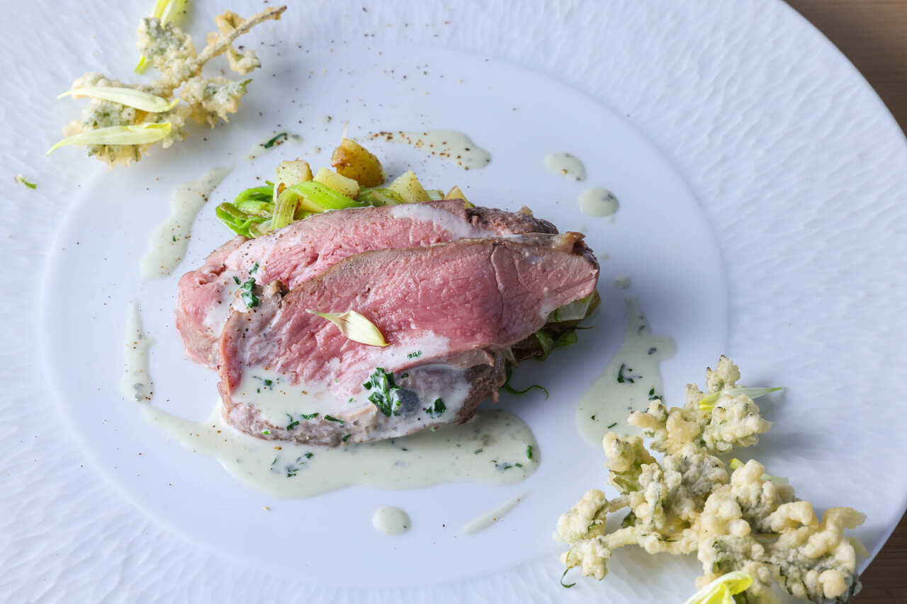 ・フランス・ロゼール産仔羊モモ肉のロティ 静岡産新じゃがいもと葉ニンニク ロックフォールとムール貝のマリニエール