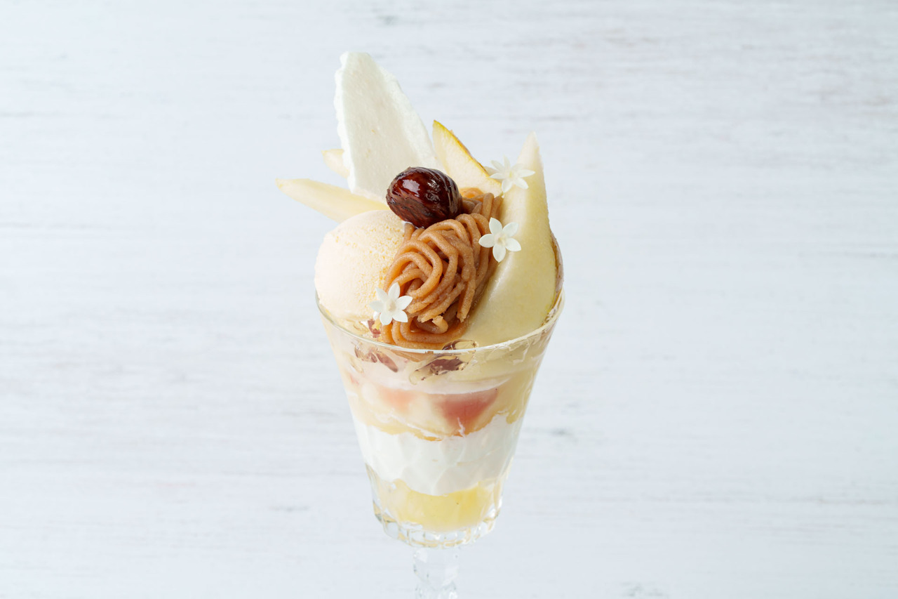 その洋梨に合わせ、笠間栗と洋梨をブレンドしたクリームや、洋梨の白ワインコンポート、洋梨のアイス、またエディブルフラワーのジュレなど、華やかなパーツが織りなす至福の一品を存分にお楽しみください。