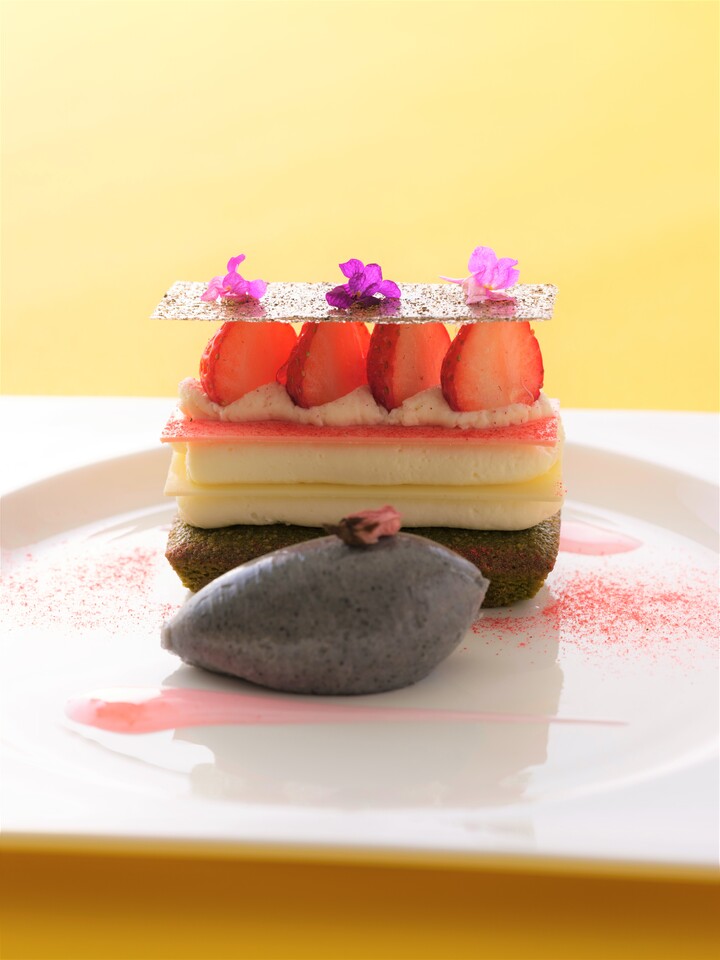 そのぎ抹茶と柚子のムース 金柑のコンポート