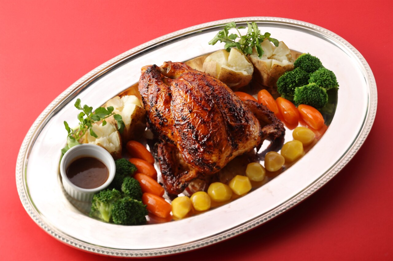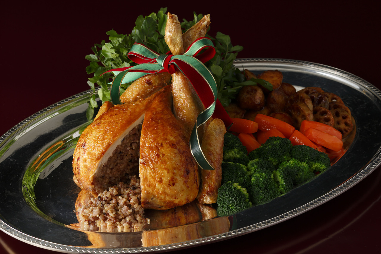 ~ホテルオリジナル雑穀米”Jシリアル”を使用したスパイシーピラフを、国産鶏に詰めてジューシーに焼き上げた、ボリュームたっぷりのローストチキンです~