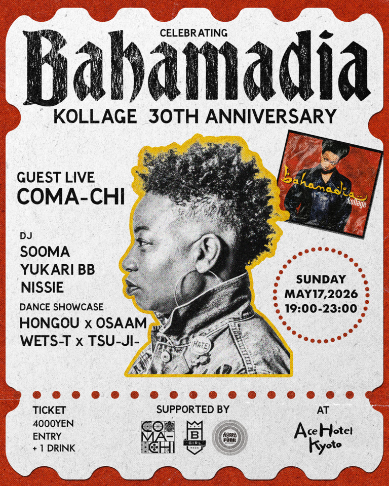 To commemorate COMA-CHI's 20th anniversary, and with the support of Hydrofunk Japan, BAHAMADIA will celebrate the 30th anniversary of their album "Kollage" with a special night at Ace Hotel Kyoto.