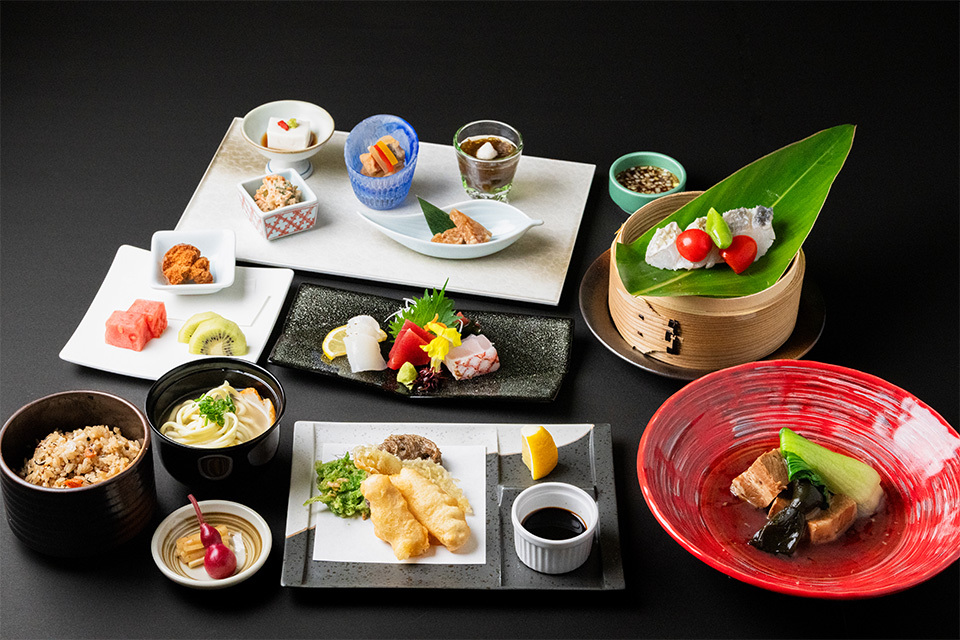 First course: Appetizer: Jimami tofu, Gurukun Nanbanzuke, Mimiga with peanuts, Mozuku vinegar, Tibichi simmered sashimi, Assortment of three kinds of fish caught in the seas off Miyako Island Second course: Boiled dish: Steamed Chinese rafti, Makubu shell ginger wrapped in shekwasha and green onion sauce Third course: Deep-fried dish: Miyako Panbin (Okinawa-style tempura), mozuku, australia, and island vegetable tempura Meal: Juicy (Okinawan-style rice), Miyako soba Dessert: Sata andagi, fruit