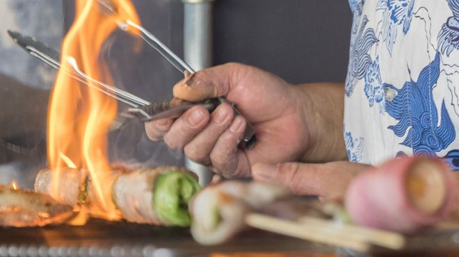 The wooden tables, partition walls, lanternlike lighting, and ceiling objects give off an exotic yet friendly atmosphere. Their skewers are very popular, made with various vegetables rolled with Okinawa Agu pork. They recommend 8 or 5 vegetable rolls selected by them. There are several courses where you can enjoy this vegetable roll assortment and several of their typical menu items together.