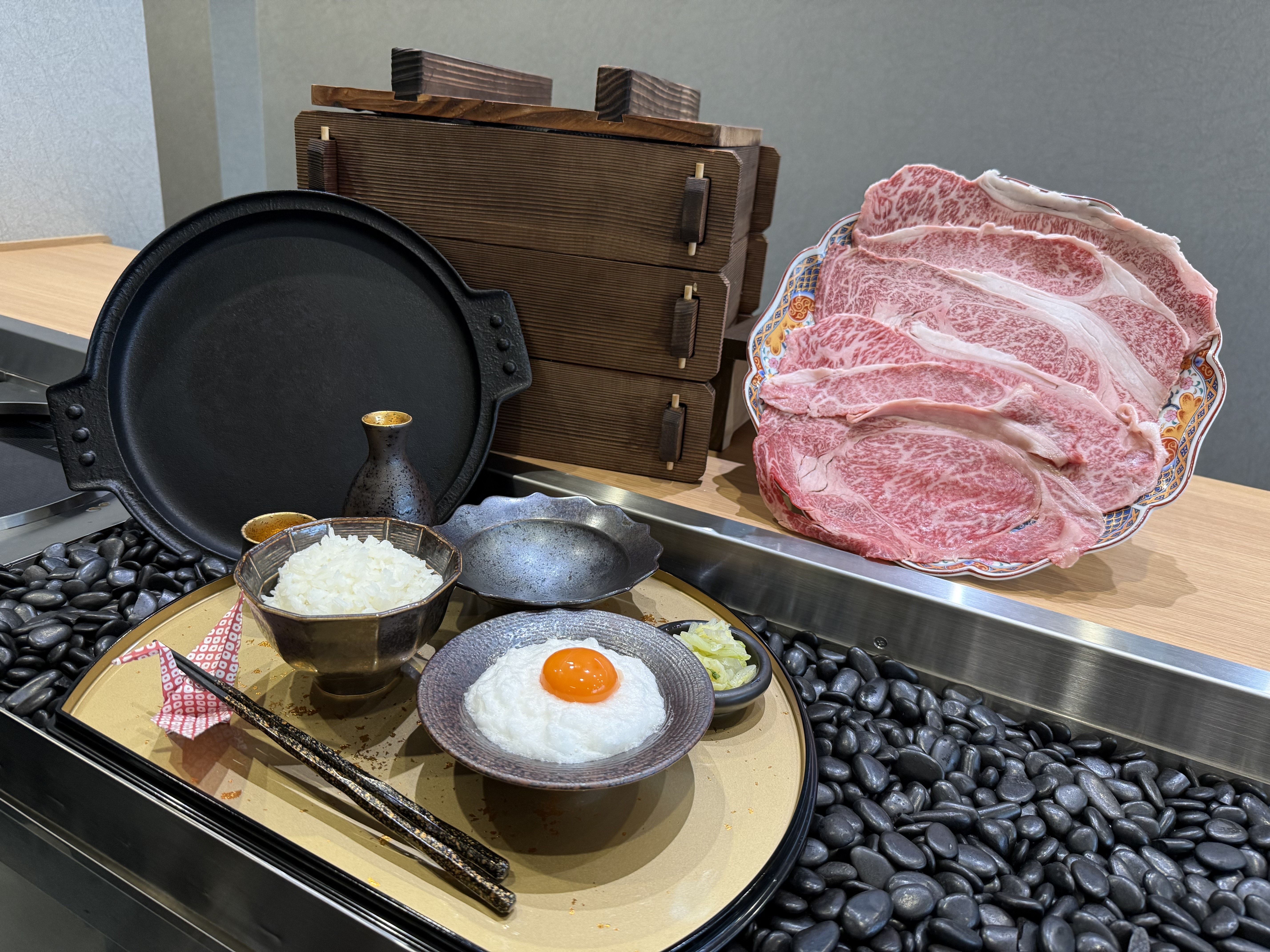 Two sirloins and two ribeye steaks. Enjoy the finest Wagyu beef, carefully selected through extensive meat research. The rice, hand-picked by the chef himself, is exquisite. The fluffy, meringue-like egg is the perfect complement to the richly seasoned yakisuki.