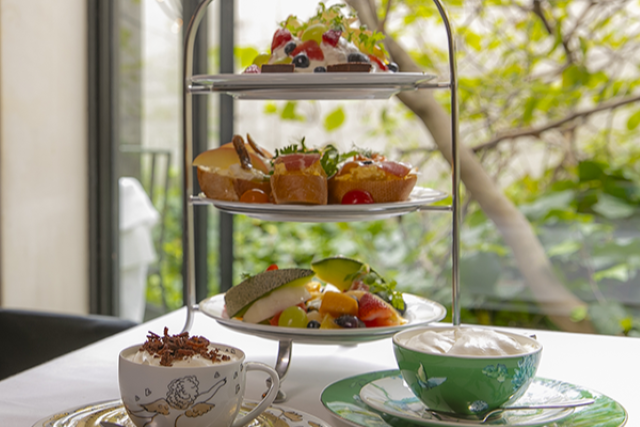A colorful three-tiered plate with seasonal fruits, cake, and hors d'oeuvres. Enjoy with your favorite drink. (*Alcoholic drinks and some other items are not included in the set. Please ask the staff for details.)