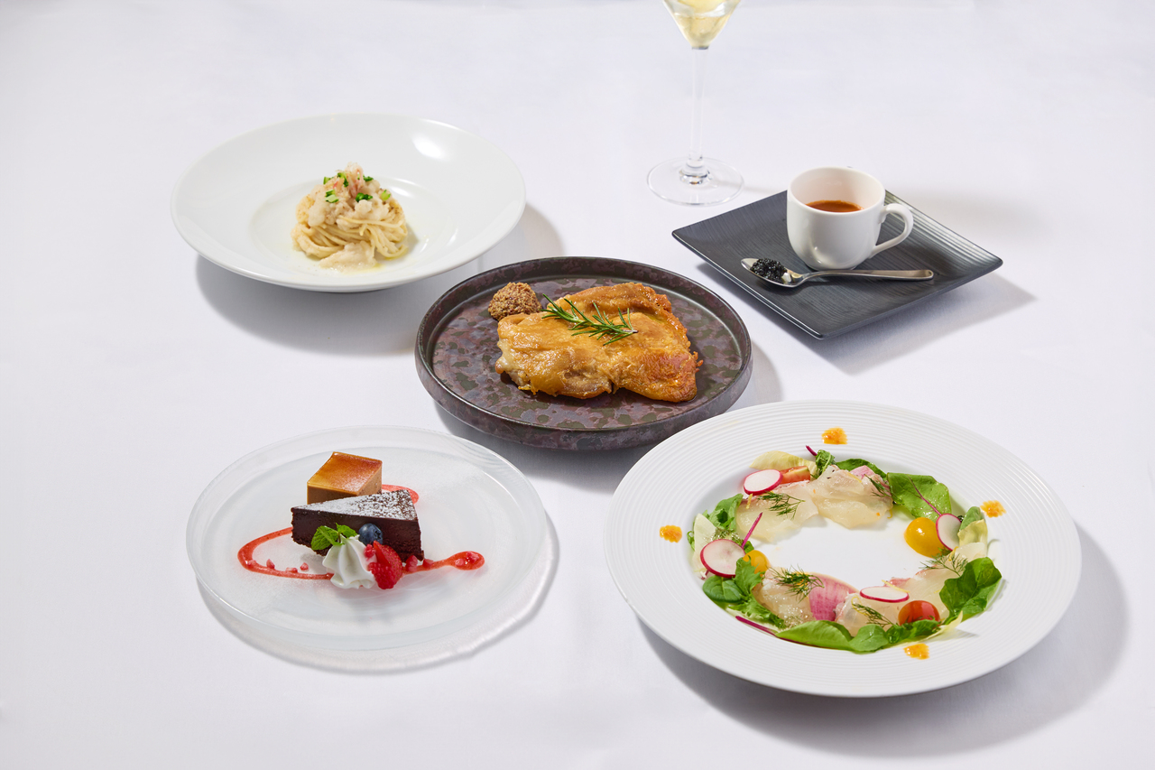 みなとみらい駅直結「トゥエンティフォーセブンレストラン」が贈る、記念日ランチプラン。乾杯スパークリングワインでスタートするコースは、温菜にオマールソースのフラン、鮮魚のカルパッチョ、パスタ、ジューシーな肉汁が食欲をそそる肉料理にデザート盛り合わせの全5皿。さらにコーヒーなどのドリンクがビュッフェスタイルで楽しめる! デザートにはメッセージを添えられるから、記念日にもぴったり。みなとみらいの景色を眺めながら、ちょっと贅沢なランチタイムを過ごして。