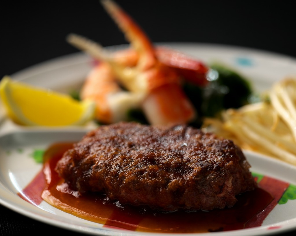コーンスープ, フライドチキン, エビフライ, フライドポテト, ボロネーズスパゲティ, 温野菜, 国産牛の角切りステーキ, フレッシュフルーツとバニラアイスクリーム